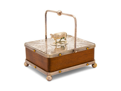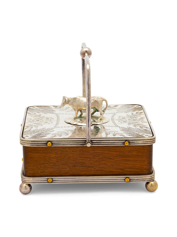 having an engraved lid with standing cow finial, swing handle, with a porcelain liner.