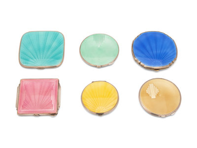 Six English Art Deco Guilloche Enamel Silver Compacts