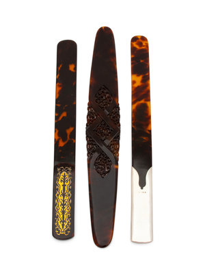 comprising one silver mounted, Birmingham,1908, one with a pierced carved center section, and one with brass inlay.