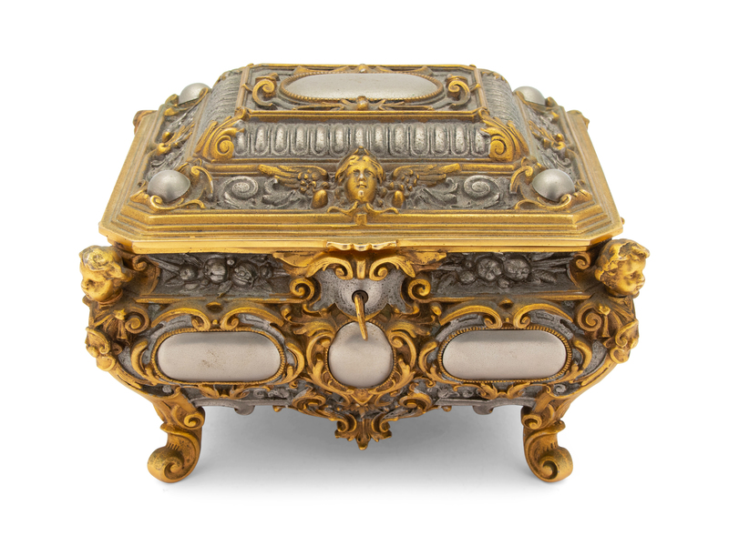 A French Belle Opaque Style Silvered and Gilt Metal Jewelry Casket