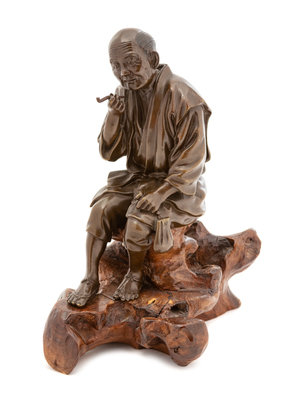 A Japanese Bronze of a Seated Man Smoking Pipe