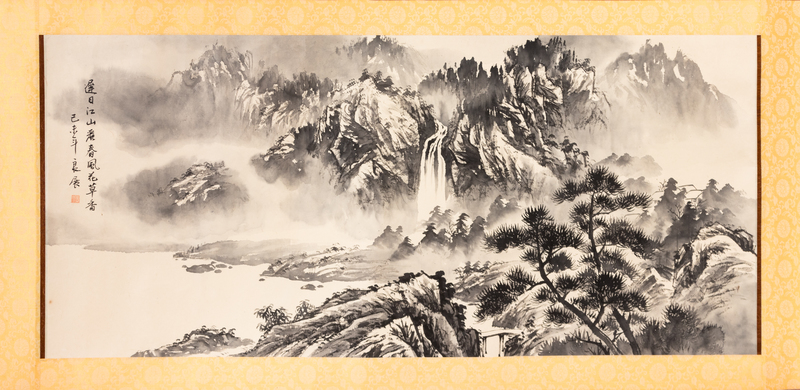 depicting an expansive mountain scene with ethereal cloud-work, signed with characters and chop along left margin, silk backing.