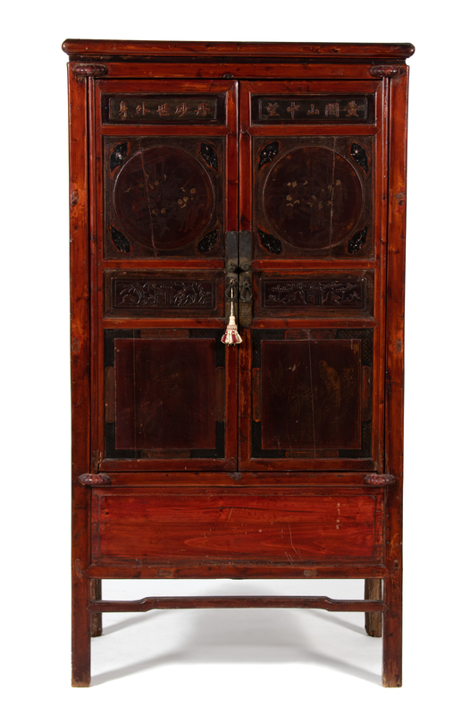 having polychromed lacquered door panels and smaller carved panels.