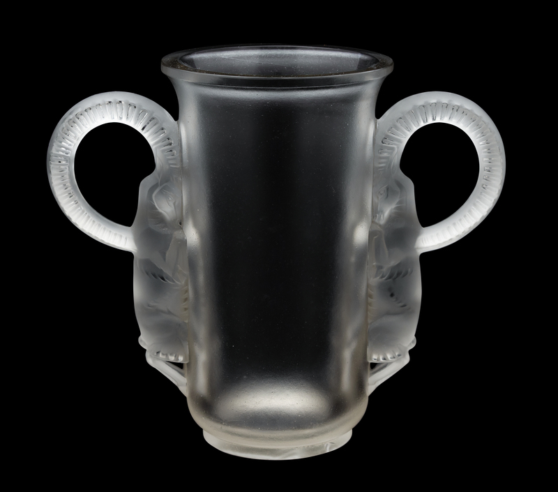 of cylindrical form, mounted with goat-form double handles; wheel engraved R. Lalique France on base.