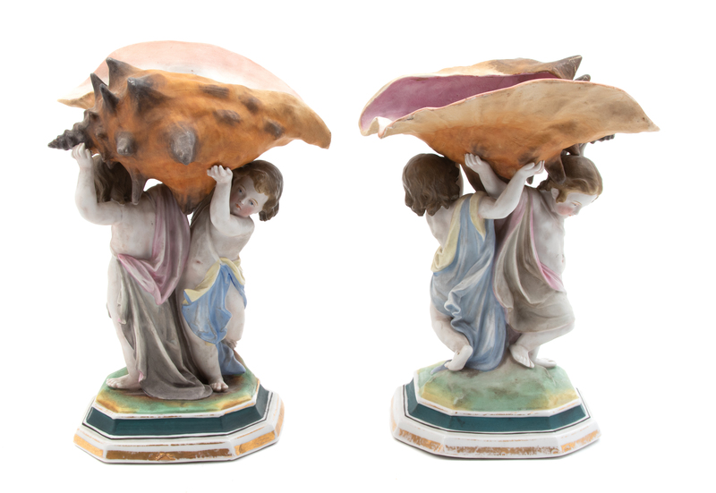 each depicting two putti holding a conch shell aloft.