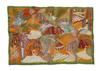 depicting dancing women amidst a tropical landscape; signed M. Colaco.