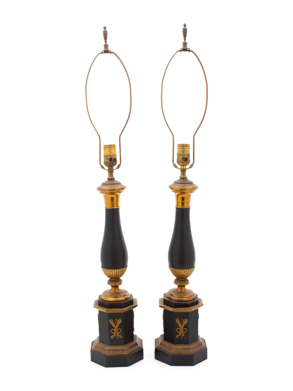 A Pair of Empire Style Ebonized and Gilt Metal Table Lamps