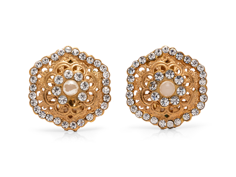 Overall good condition. Small faux pearls have moderate paint loss, one earclip is missing one rhinestone.