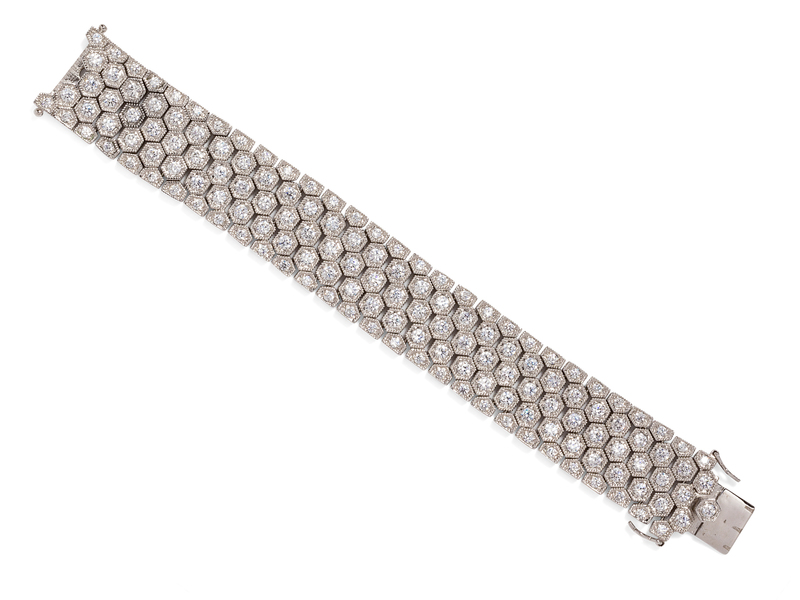 Honeycomb pattern with cubic zirconia and a box push button clasp with two safety clasps.