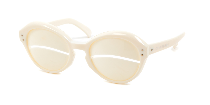 Off-white plastic with silvertone hardware, solid lenses with slit cutout.