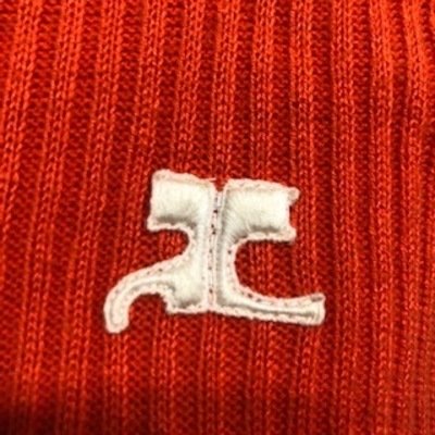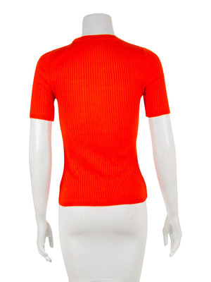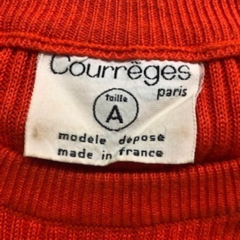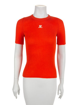 Orange acrylic knit top with crew neckline and short sleeves. The designer's initials, AC for André Courrèges, are appliqued to the center front neckline.