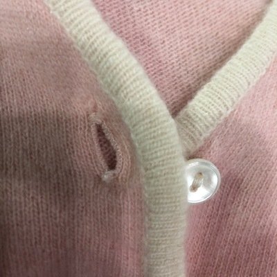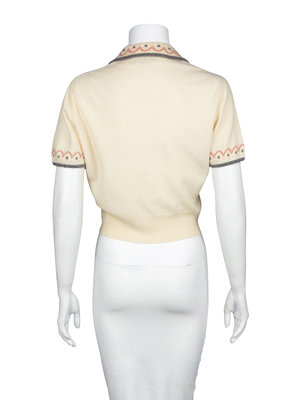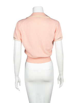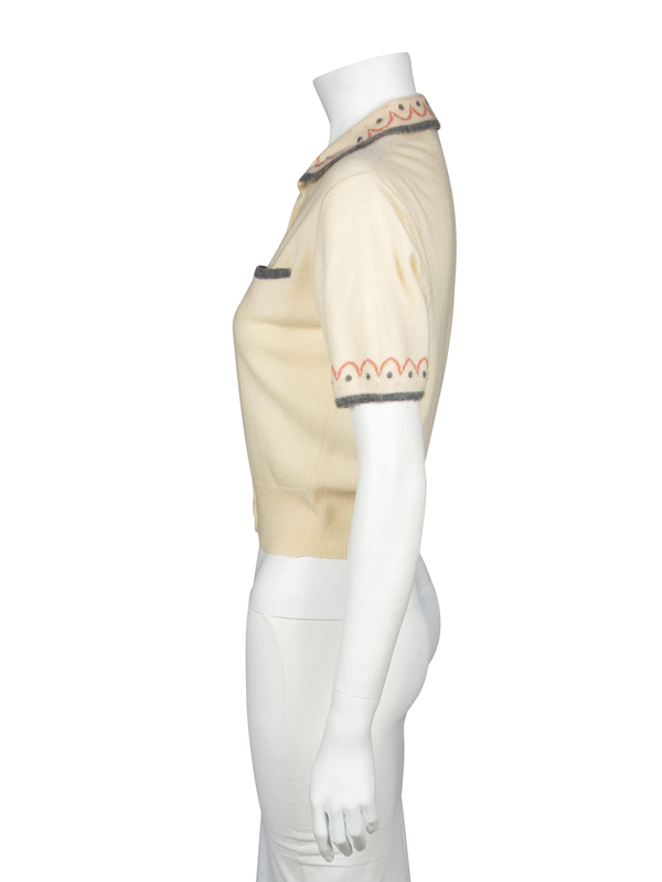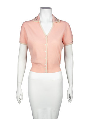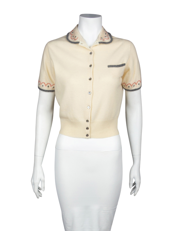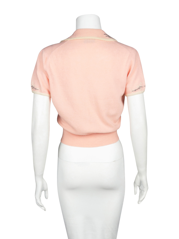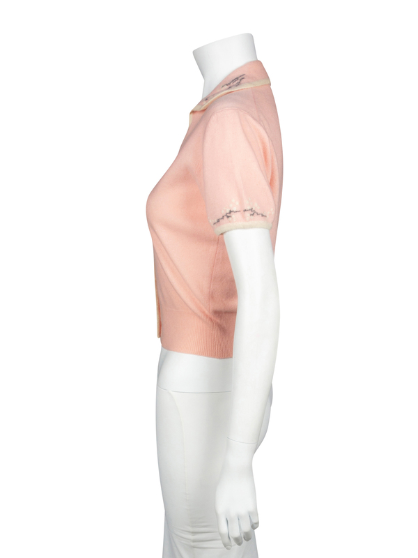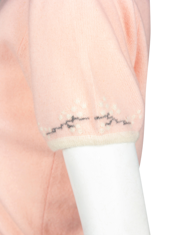 One pink and one cream cashmere sweater finished with a turn down collar, short sleeves and a center front button closure. The pink is trimmed with white knit and decorated with a branch and bloom design on the collar and sleeve. The white is trimmed with grey knit and is decorated with a pink and grey scallop and dot pattern.
