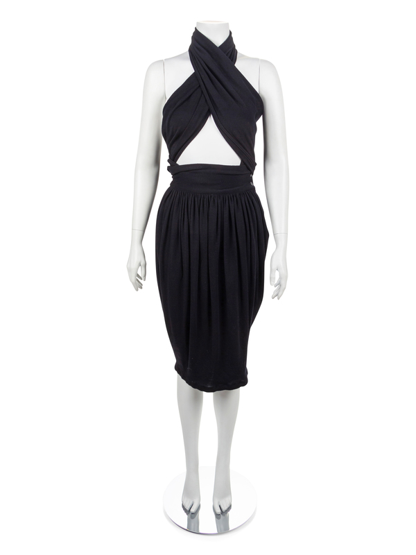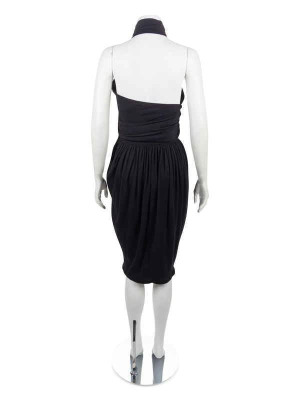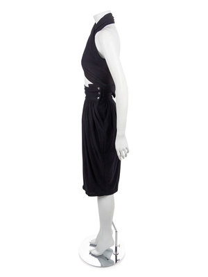 Black knit skirt is made with a wide waistband that closes with three buttons.The skirt is very full in the hip and gathered heavily into the waistband. Extending from the closure is a panel of knit that wraps around the bust to create the top part of the dress.