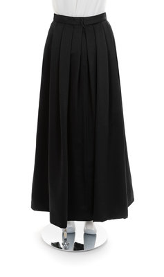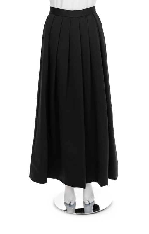 Long black satin skirt with deep pleats into a waistband with a center back zip and hook and bar closure. The satin is underlined with black net. The skirt is lined.