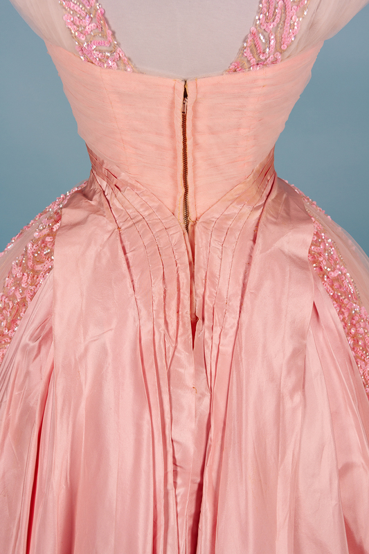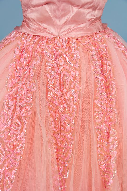 Very full pink tulle ball gown trimmed with pink silk taffeta and pink and clear sequins. The boned bodice features an hourglass silhouette with straps made of tulle and sequins. The very full skirt is made of layers of tulle that are supported by an inner skirt with boned hips. The dress closes down the center back with a zip.