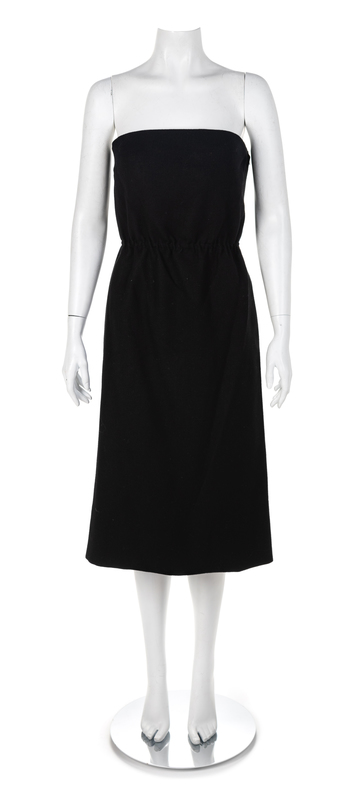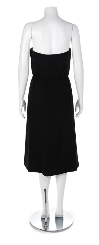 Strapless black wool crepe dress with internal boned bodice and gathered elastic waistline. The dress is lined with a black silk and closed at the side with a zip and hook and eye. Elastic waist with exterior side zip closure, fully lined with an interior, side boning, and a side zip closure.