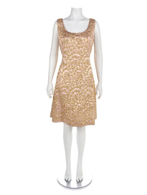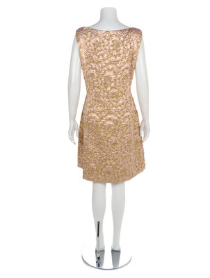 Pink and gold lamé weave fabric with a raised design in gold lamé in a floral pattern. Further outlining the floral pattern in the weave is embroidered gold lamé cord, rhinestone and beads. The dress is cut with a wide scoop neckline, sleeveless and with a princess line cut with slip pockets over the hips. The dress closes with a zip down the back left princess seam.