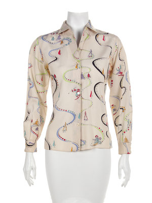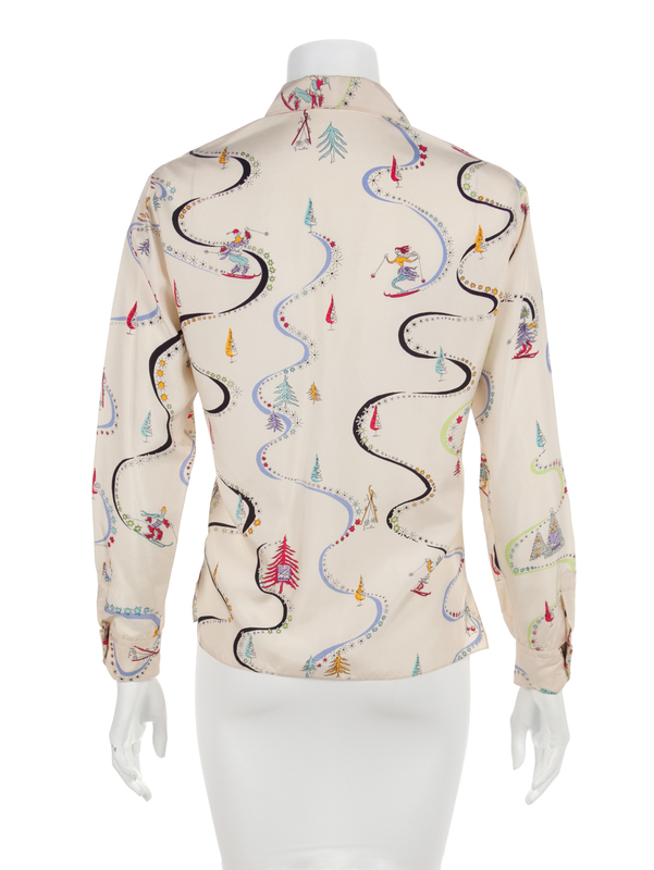 White silk shirt printed with skiing scene of trees ad skiing figures with long sleeves and a center front button closure.