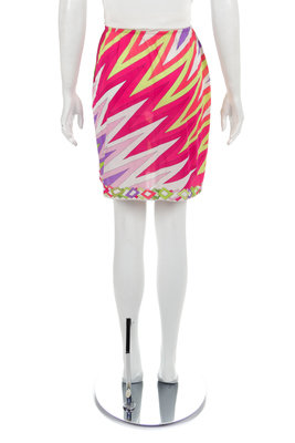 Synthetic knit slip printed with zig-zag design in bold colors. The a-line slip is gathered into an elastic waistband.