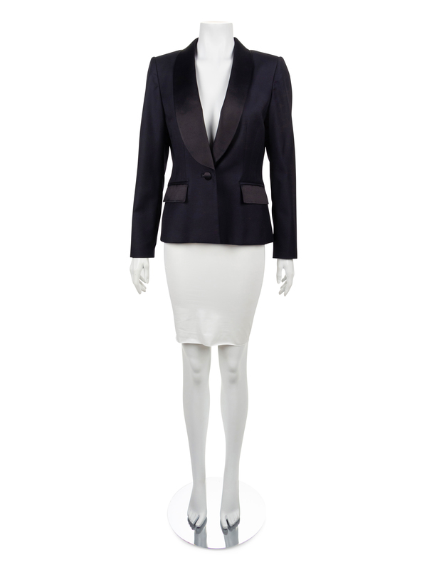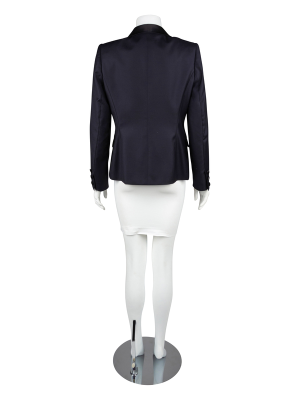 Black twill jacket with black satin lapel, pocket flaps and covered buttons. The jacket is cut with a curved lapel, long sleeves with three buttons at the hem and a center front single button closure. The jacket is lined.