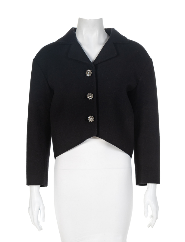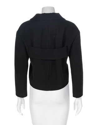 Black wool jacket cut in a 1960s style with 3/4 length sleeves, notched lapel and a center front rhinestone snap-button closure. Full back is gathered behind a self-fabric and attached belt. Fully lined.