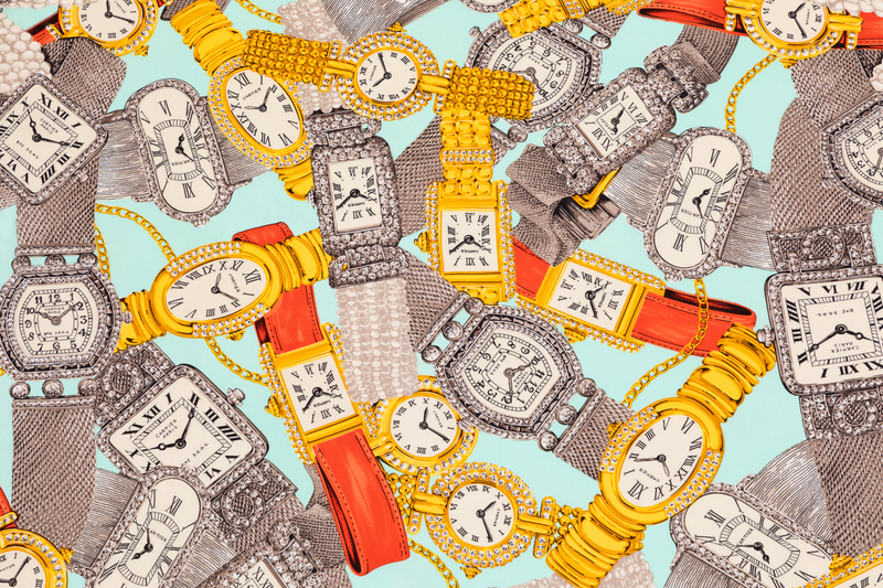 With print of watches with leather and pearl straps.