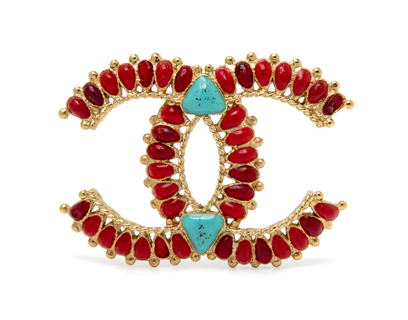 Goldtone with red and blue stones with a back pin and safety clasp.