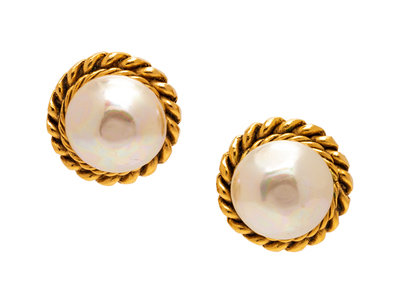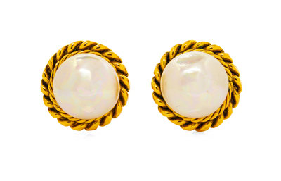 Irregular faux pearl set within a double gold tone rope detail. 1" diameter.