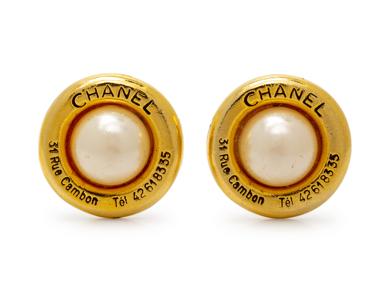 Goldtone bezel stamped with '31 Rue Cambon, Tel 42618335' surrounding a central faux pearl.