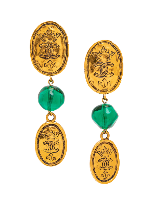 Goldtone discs etched with CC under a crown and an irregular circular green stone.