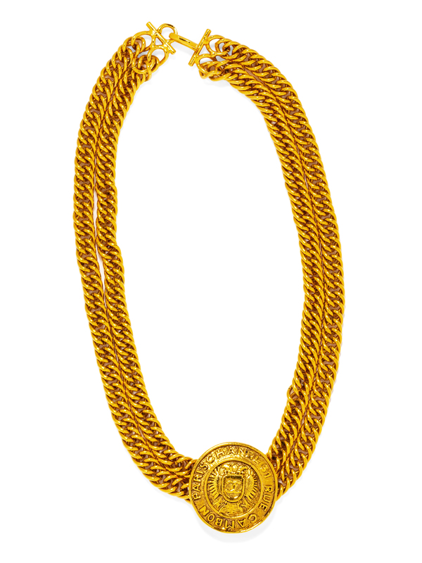 Goldtone coin with 'Paris Chanel 31 Rue Cambon' around the edge and attached to a double chain and hook and eye clasp.