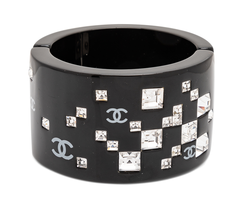 Black resin with square faceted rhinestones and gray logo CC's, silvertone hardware and a magnetic clasp.