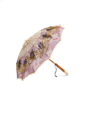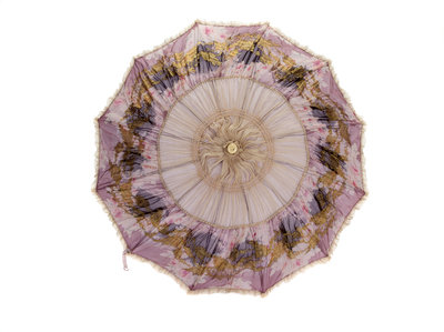 Sheer off-white silk crepe parasol cover edged with a wide panel of purple sheer crepe printed with flowers and woven with gold lamé thread. The cover is lined with purples silk and the metal spines are also covered with the same purple fabric. The central spine is made of wood with a metal slide and carved tips.