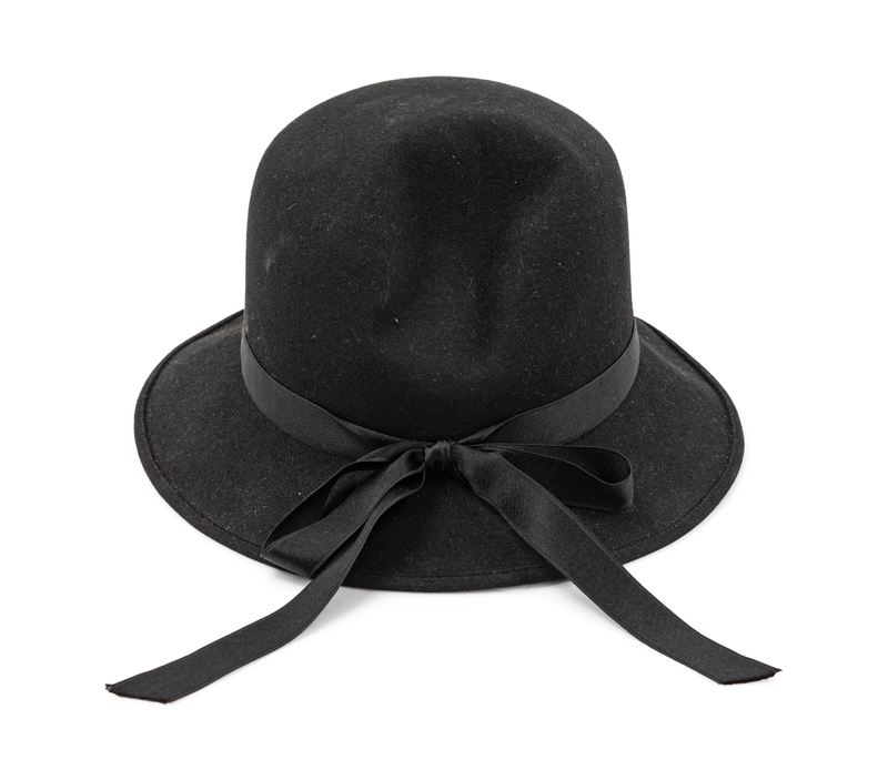 Black felt hat with black ribbon and bow. Internal grosgrain ribbon forms internal hat band.