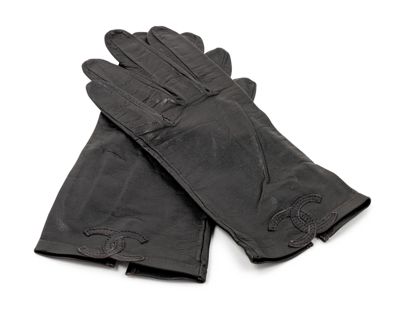 Black leather gloves with appliqued black leather CC logo at wrist.
