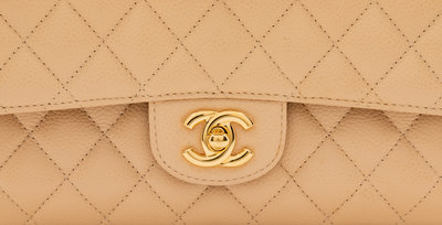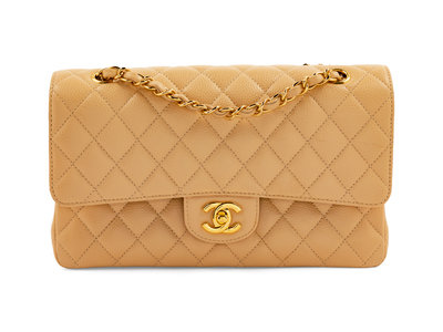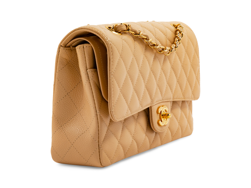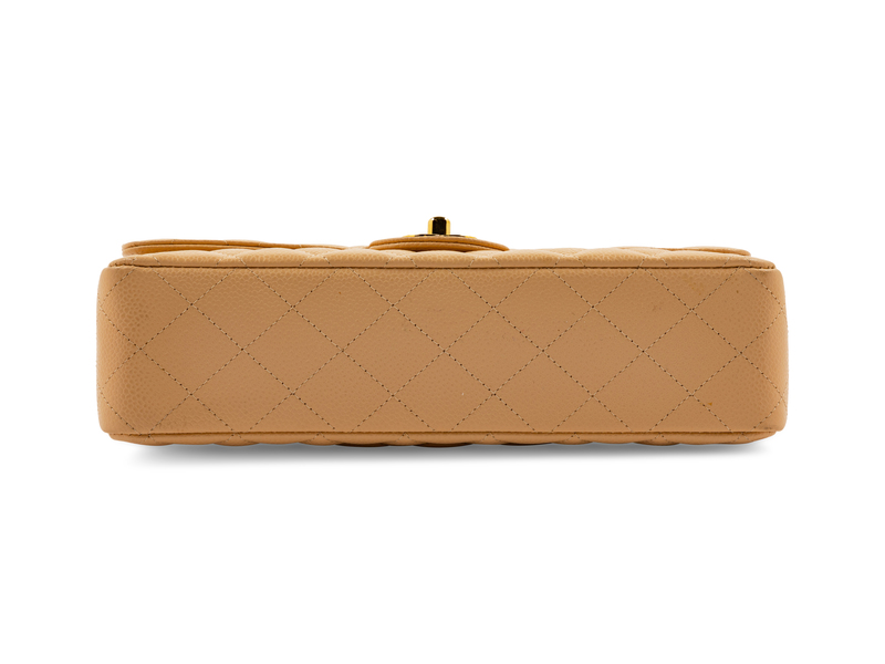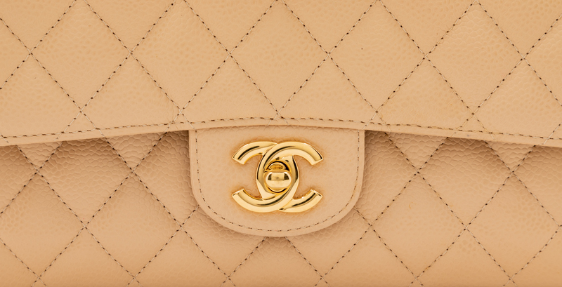 Quilted Caviar leather, double flap with CC turn lock closure, gold plated hardware, one front slip pocket, a half moon back pocket, one interior flap zip pocket and two interior slip pockets, classic double chain and leather shoulder strap.
