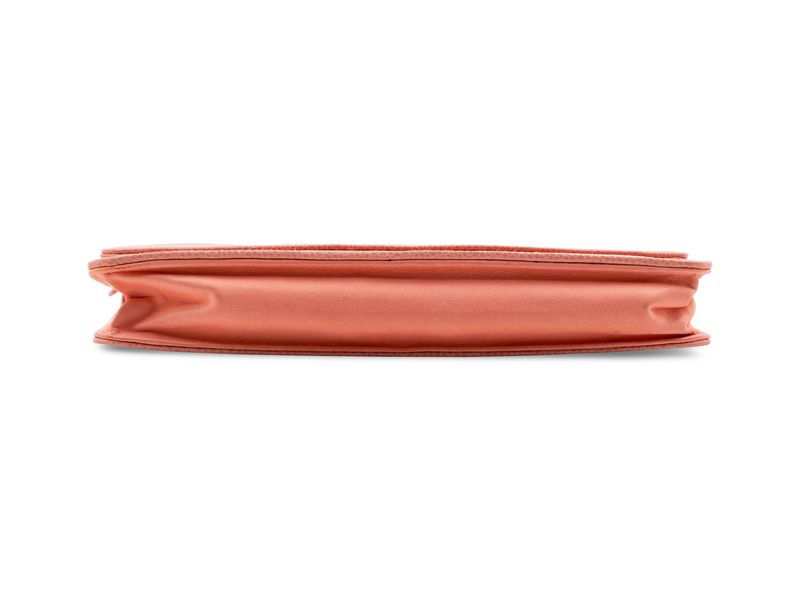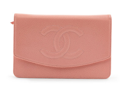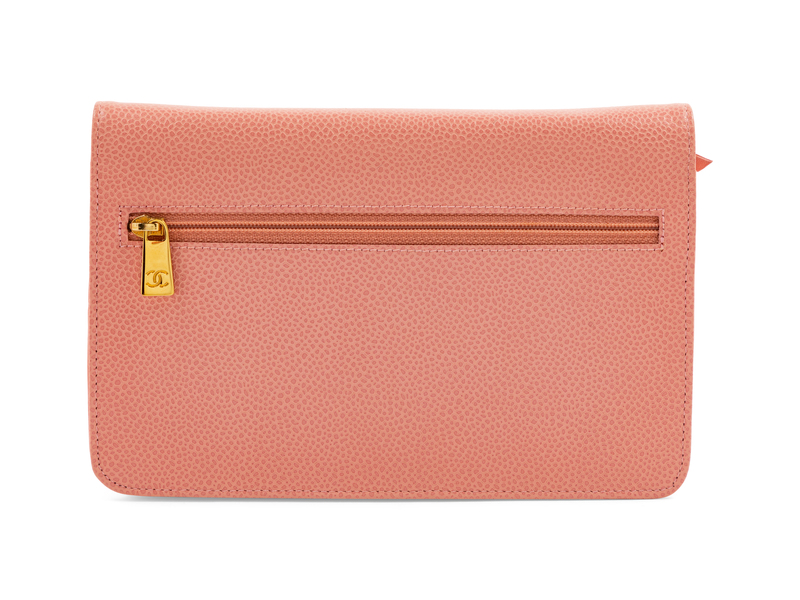 Pink caviar leather with goldtone hardware, back exterior zip pocket, one front slip pocket and zip pocket, one interior compartment with slip pocket and card pockets, front flap with CC logo and snap button closure with a classic chain and leather shoulder strap. Together with a box.