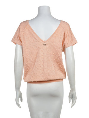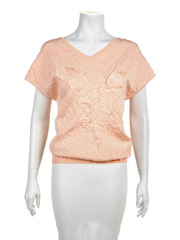 Sleeveless v-neck pink sweater with a stylized and raised pattern. A small rectangular silverton piece with CC is stitched to the center back neck.