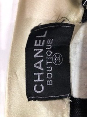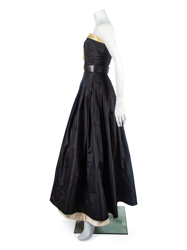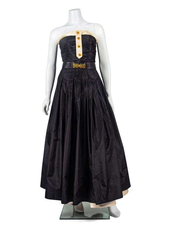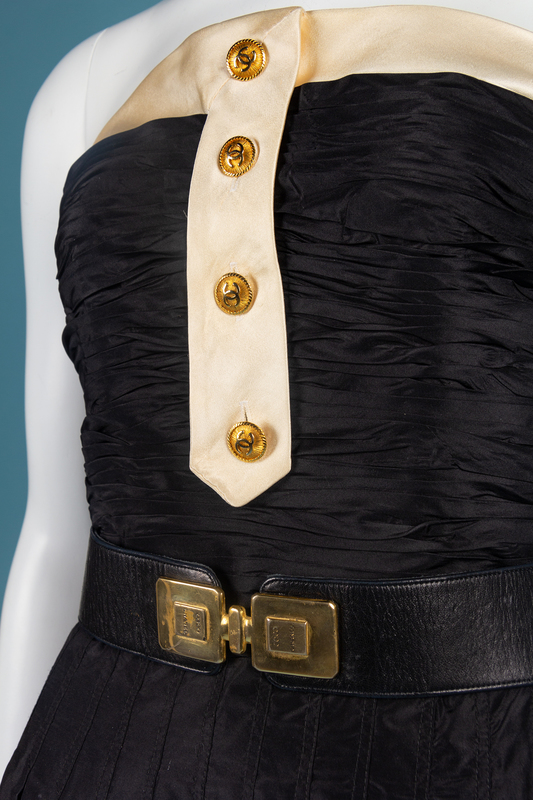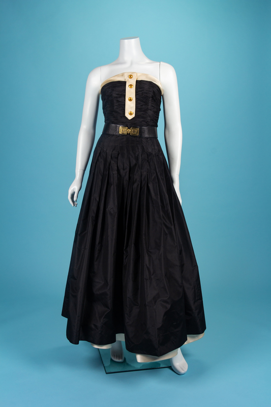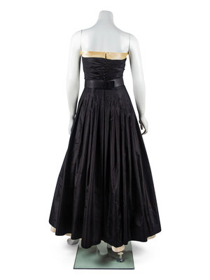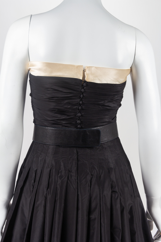 Strapless dress of black silk taffeta with ruched bodice and full skirt pleated into the waistline. The dress is made of two layers sewn together, with an inner boned bodice attached to a full petticoat. The top of the bodice and the hem of the petticoat are edged with cream silk satin with the satin on the bodice extending down the center front and is held in place with four goldtone buttons that feature the CC logo. The inner layer is closed down the center back with a zip and the silk exterior closes with small black fabric covered buttons and loops.