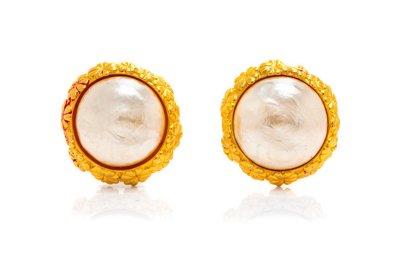 Gold tone floral wreath with central faux pearl. 1.5" diameter.