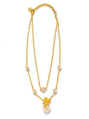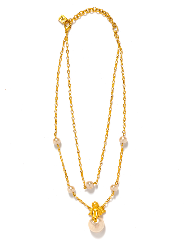 Double strand of gold tone chain with faux pearls. Central gold tone angel holds largest faux pearl.