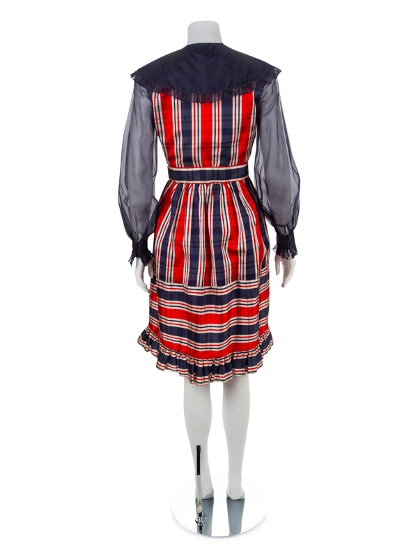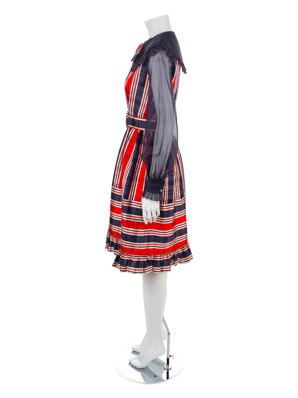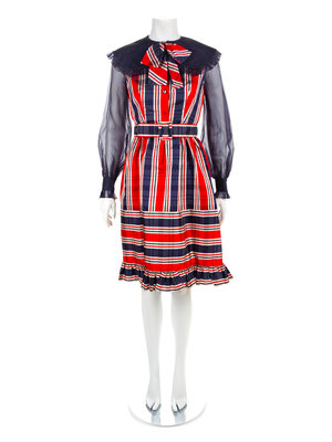 Red, white and blue plaid silk taffeta dress with fitted bodice and full skirt with a gathered hem. The crew neckline is finished with a wide blue collar and the long sleeves are made of sheer blue fabric gathered into a wide and buttoned cuff. The dress closes down the center front with a buttoned placket. The bodice is lined in blue silk and the skirt is unlined. A self fabric belt is lined with blue leather.