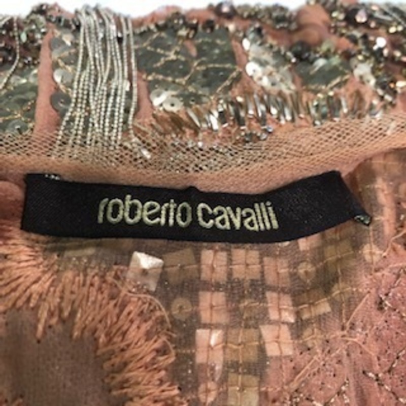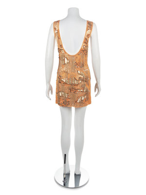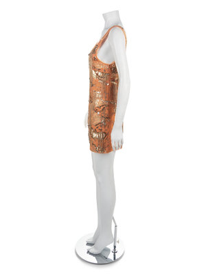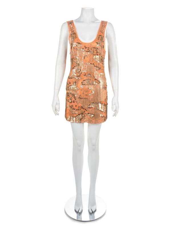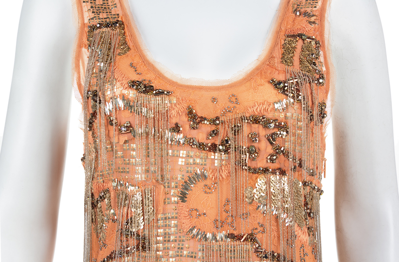 Sleeveless peach crepe dress with all-over embroidery in sequins, beads and metal fringe. The dress has a scoop necline and side zip.