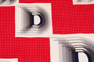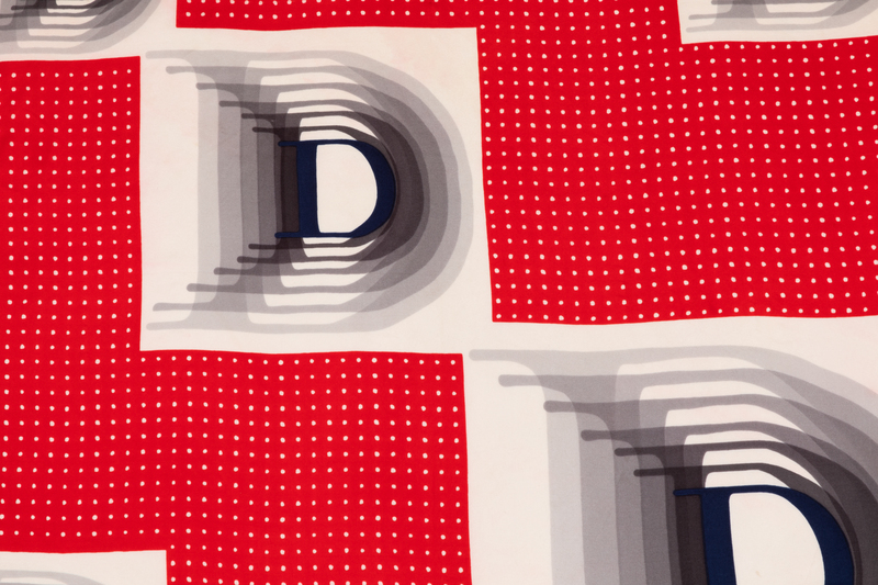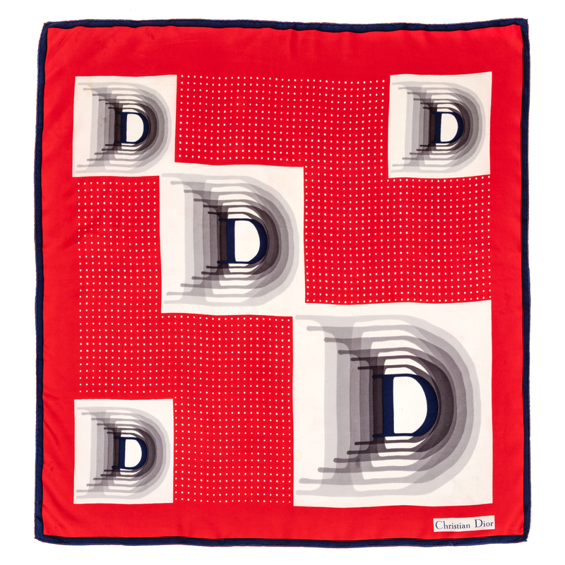 Red silk twill scarf printed with a blue and white design with five large letter 'D' set into white squares.