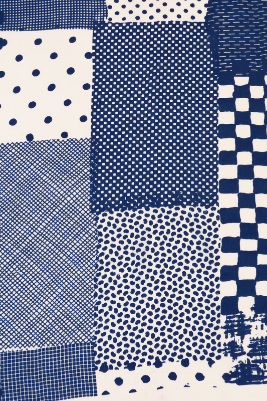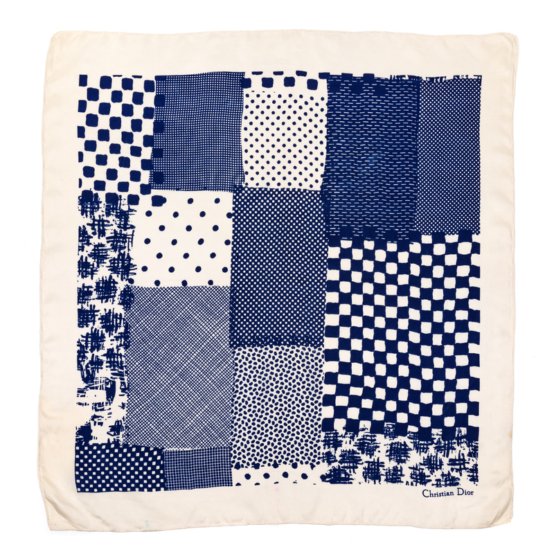 White silk twill scarf printed with an irregular blue geometric pattern.