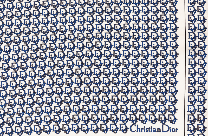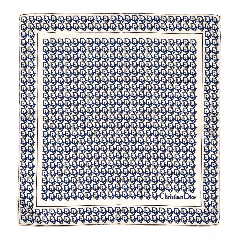 White silk twill scarf printed with the words 'DIOR' in blue and black and in an all-over pattern.