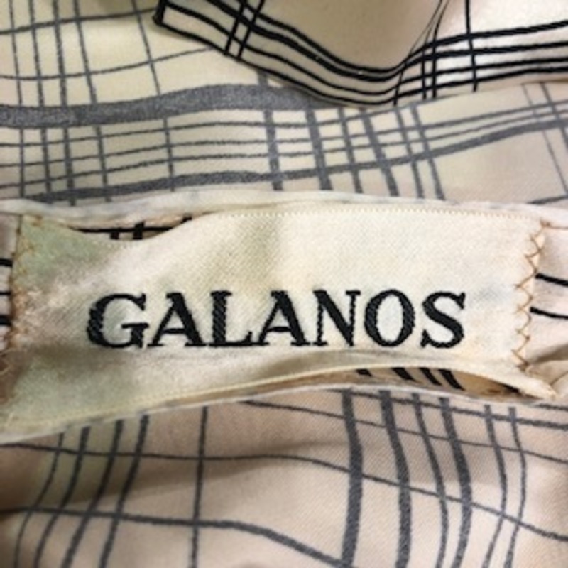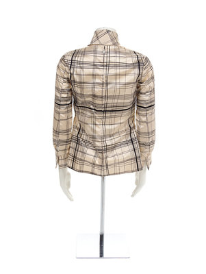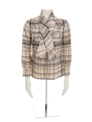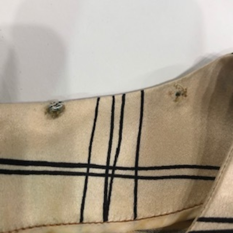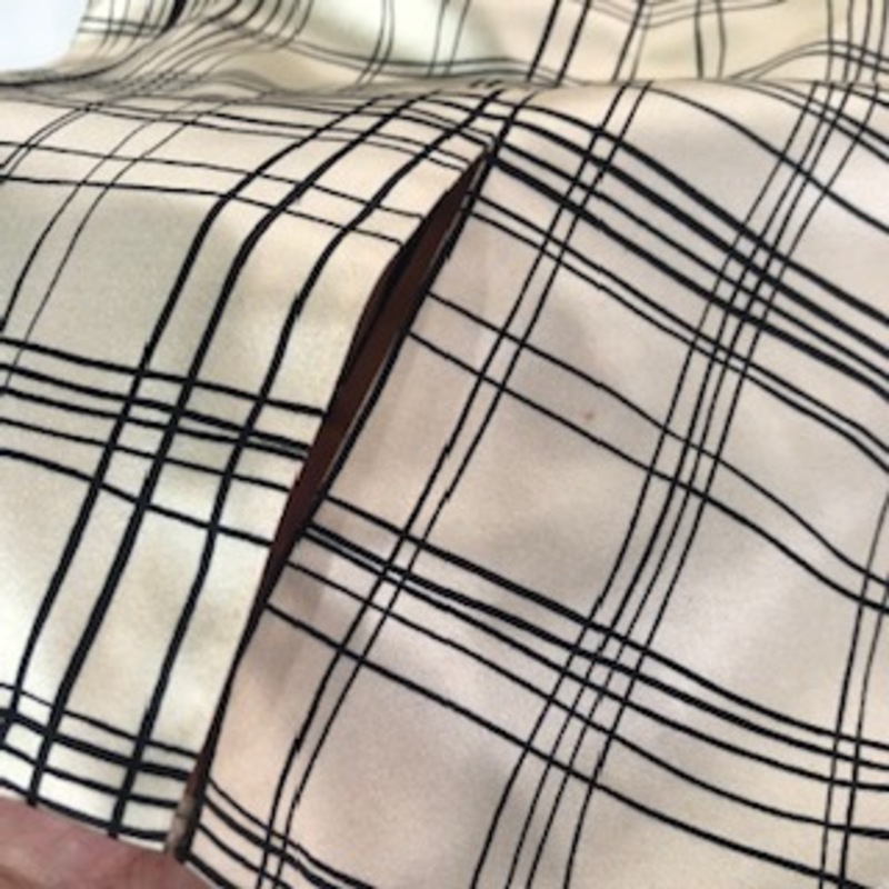 The second is cream silk satin printed with an irregular line pattern in black. A scoop neckline is embellished with an attached, self-farbci collar, extending long enough to tie. The collar wraps around the back and secures to the inside neckline with snaps.