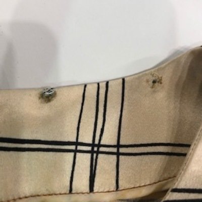 The black top is in good condition with no condition issues. The white top has yellowed under the arms, on the inside. Additionally, the center front seam at the hem has opened six inches and the snaps on the inside are loose.