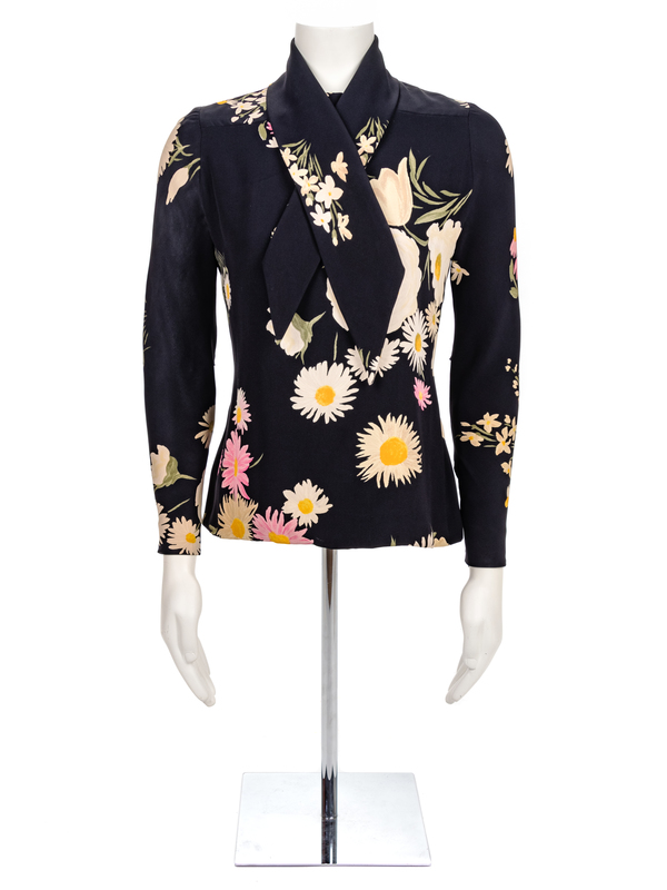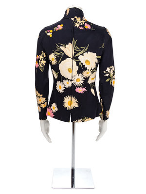 The first is a black ribbed silk with floral print and an attached self-fabric long collar. The long, tight sleeves have an open dart at the elbow and finish with a zip at the hem. The top closes with a center back zipper sewn with thread to match the print.