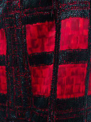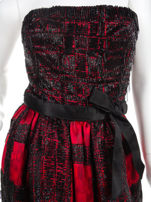 Strapless red silk satin with an Ikat print in shades of red. The dress is then embroidered with black glass beads in a plaid pattern with some beads hanging in loose fringe. The boned bodice is completely covered in black beads. The long, skirt is gathered and pleated into a waist seam, which is covered in a black silk satin ribbon. The dress is lined in black fabric and closes down the center back with a zip.